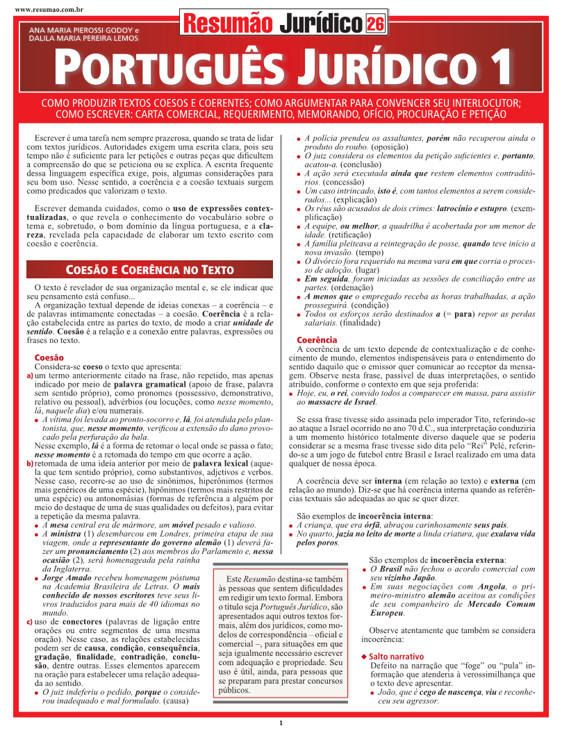 Guia prático que orienta como produzir textos coesos e coerentes e como argumentar para convencer seu interlocutor. Tudo sobre correspondência, desde uma simples carta comercial até uma petição. Expressões que, embora muito usadas, devem ser evitadas. Forma física da carta comercial. Requerimento. Ofício. Procuração particular e procuração {ad juditia}. Petição. Com Português Jurídico 2, este título oferece completa orientação para a escrita de textos na área do Direito. | Autoras: Ana Maria Pierossi Godoy | Dalila Maria Pereira Lemos | Páginas: 6