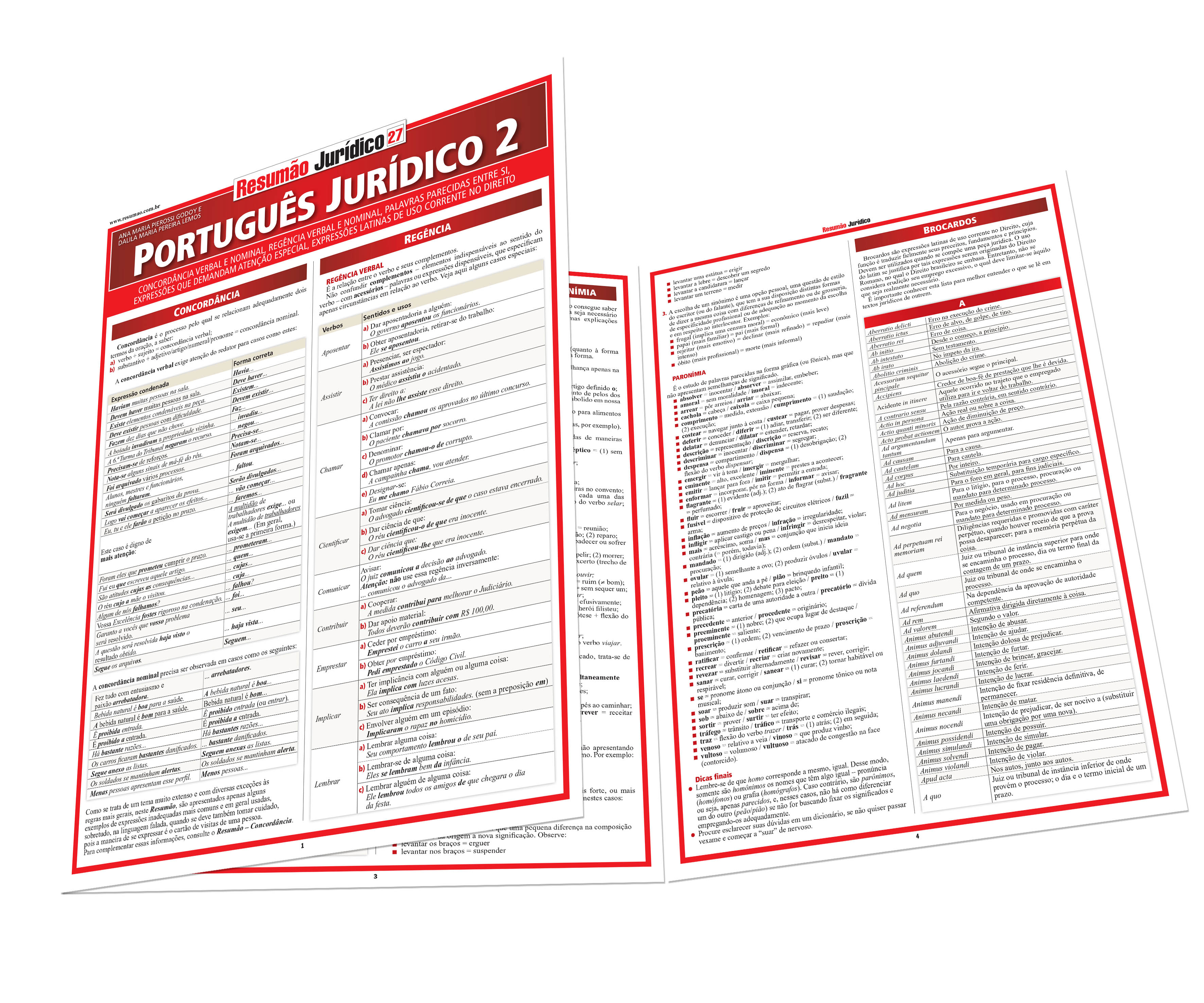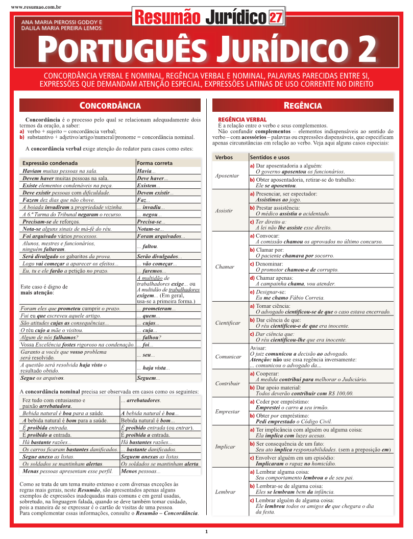 Concordância verbal e nominal, com exemplos de expressões condenadas e do uso da forma correta. Regência verbal, com destaque para verbos de uso frequente, sentidos e usos corretos. Regência nominal, com exemplos de usos recomendados e de usos condenados. As expressões que não devem ser usadas (com exemplos das que devem ser usadas no lugar delas) e as expressões que não devem ser confundidas. Palavras que confundem o redator: homonímia, sinonímia e paronímia. E mais um extenso quadro com expressões latinas usadas no Direito. | Autoras: Ana Maria Pierossi Godoy | Dalila Maria Pereira Lemos | Páginas: 6