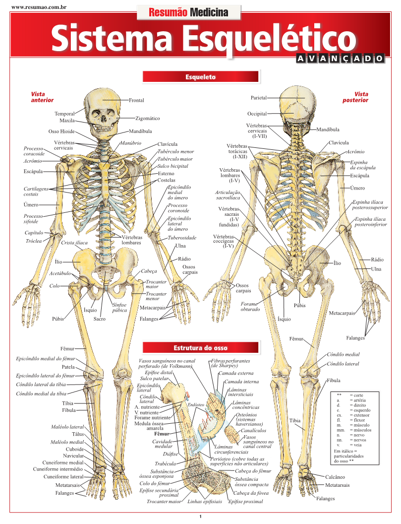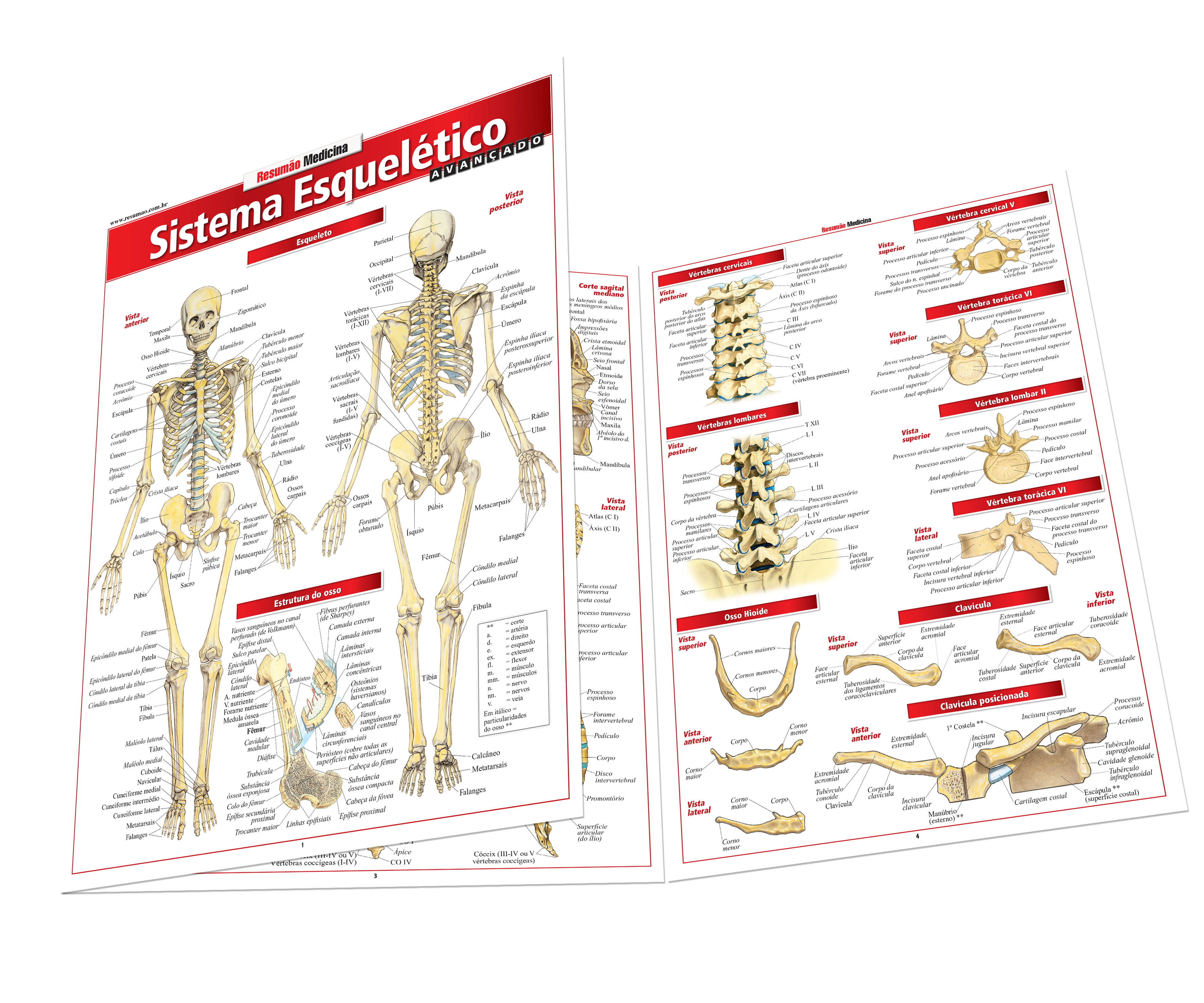 Mais de 40 ilustrações detalhadas, com indicações anatômicas para facilitar a identificação dos ossos do corpo humano. Esqueleto: vistas anterior, posterior e lateral, estrutura do osso e crânio (vistas anterior, inferior. frontal interna, posterior interna, lateral e corte sagital mediano). Coluna vertebral (vistas anterior, posterior e lateral); vértebras cervicais e lombares, osso hioide, clavícula, escápula, tórax, costelas, cotovelo, mão direita, pé e quadril esquerdo. | Páginas: 6