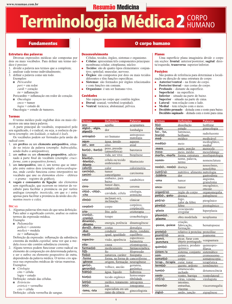Este guia apresenta os conceitos por trás das expressões médicas mais comuns. Fundamentos, estrutura das palavras e dicas. Terminologia por grupos e um extenso glossário dividido pelos sistemas do corpo humano com o significado dos elementos básicos usados na formação básica das expressões e termos comuns da medicina. | Páginas: 6